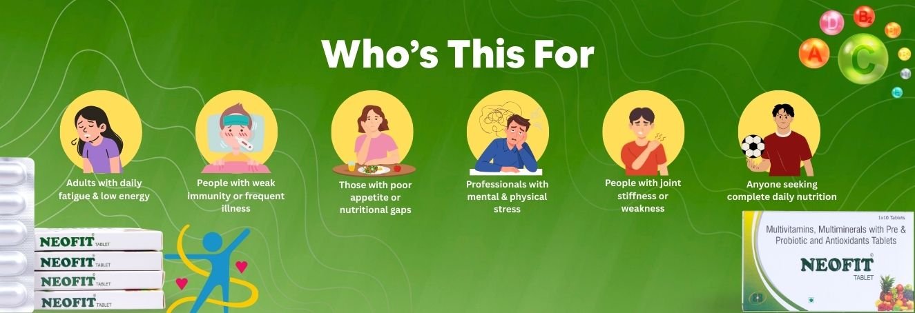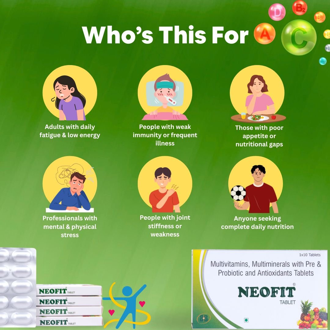 NEOFIT Multivitamin Tablets are suitable for adults who experience daily fatigue, low immunity, poor appetite, stress, or nutritional gaps due to busy lifestyles or dietary limitations.